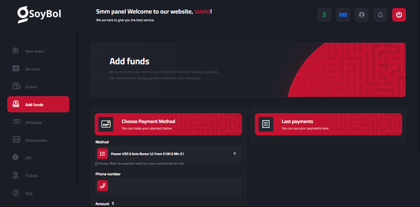 ▸ El usuario agrega fondos en el panel / El administrador también puede agregar fondos a las cuentas de usuario